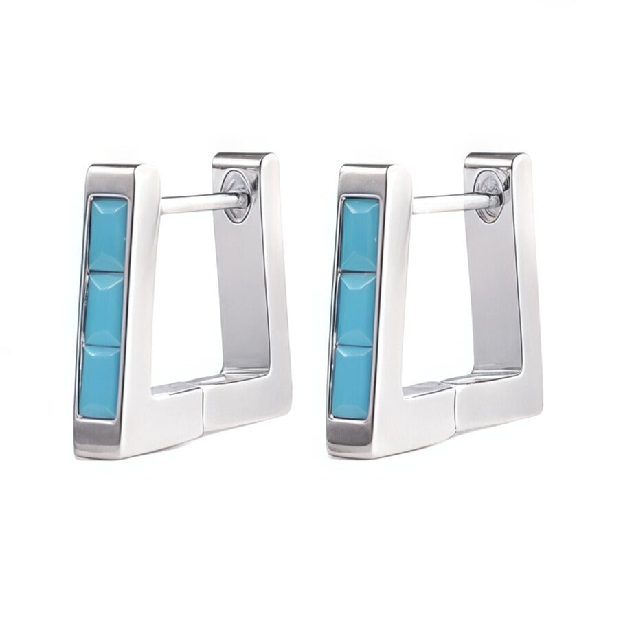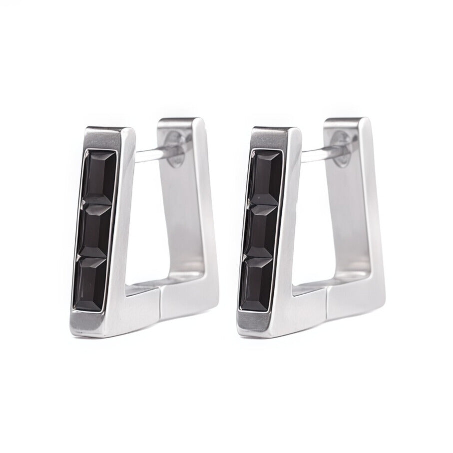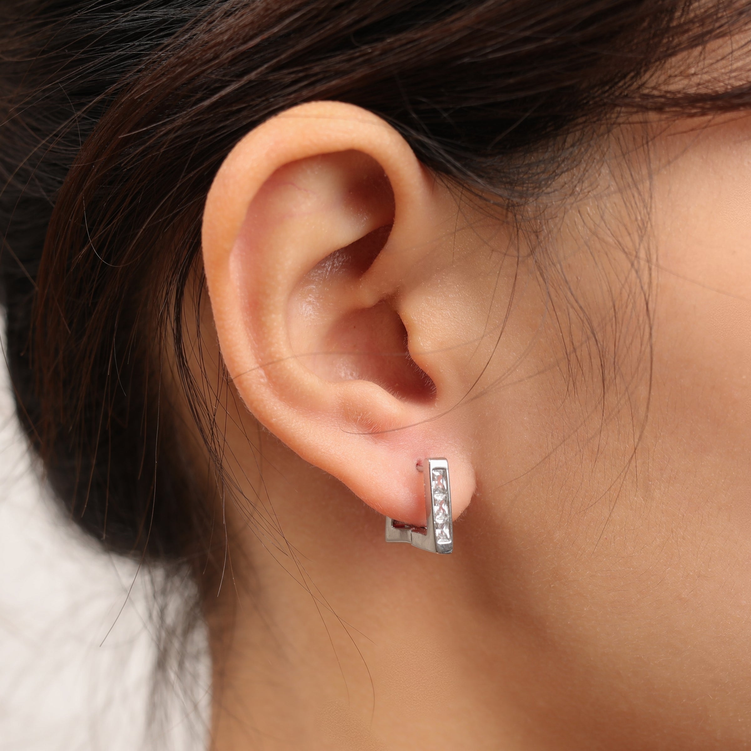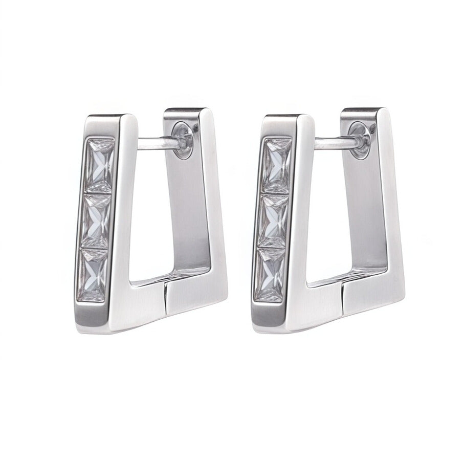 These gold-plated rectangular huggie hoops feature a row of sleek baguette-cut cubic zirconia stones, offering a minimalist yet bold look. Lightweight and easy to wear, they’re designed for everyday style, whether worn solo or stacked.